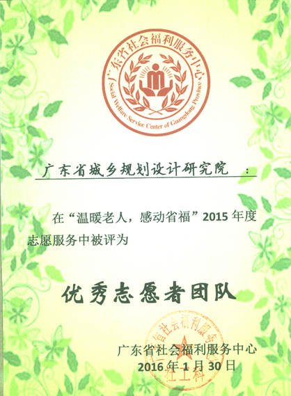 經(jīng)過一年的志愿服務(wù)活動開展,我們的工作得到廣東省社會福利服務(wù)中心的高度肯定和評價,在省福利中心2015年度總結(jié)分享活動中,我院志愿服務(wù)總隊被授予“優(yōu)秀志愿者團隊”榮譽稱號,職能部門志愿服務(wù)分隊隊長樊志敏同志、規(guī)劃三所志愿服務(wù)分隊隊長董嘉雯同志獲得年度“優(yōu)秀志愿者”榮譽稱號。