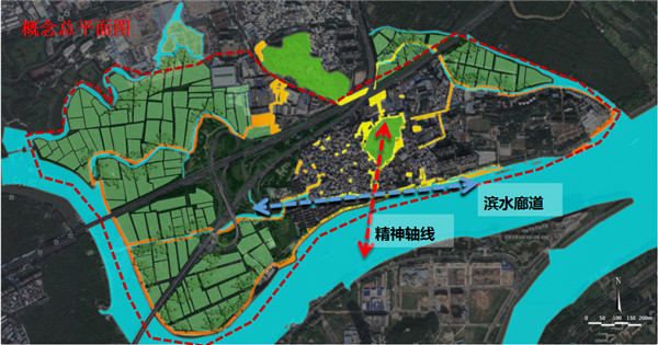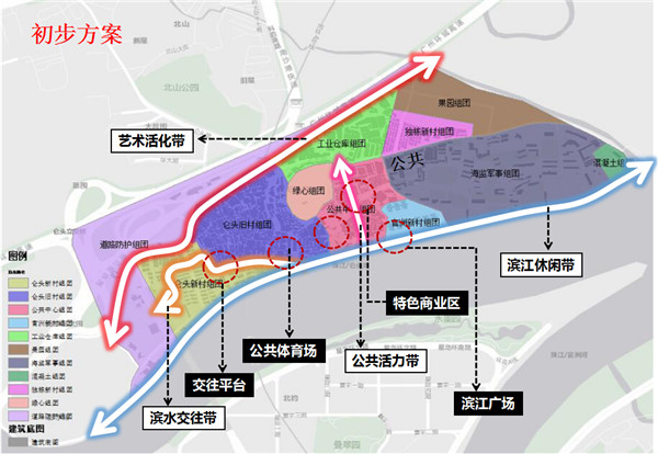 結(jié)合兩方面的分析,提出以鏈接為手段,通過適應(yīng)性設(shè)計,達到社會復(fù)愈的目的。方案構(gòu)建上,提出以休閑橫軸(濱水景觀帶)+精神縱軸(村委會、墓地公園、黎氏宗祠、侖頭公園串聯(lián))構(gòu)建為骨架,重點改造兩大片區(qū)(舊村居住、工業(yè)廠房),活化六大節(jié)點(停車場、市井商業(yè)街、復(fù)合型市場、村委會及前廣場、宗祠文化中心、墓地公園)的系統(tǒng)性框架。