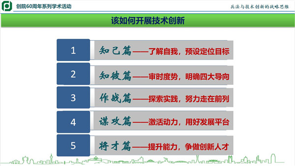 接著,邱院長活用《孫子兵法》的謀略思想,分“知己篇”、“知彼篇”、“作戰(zhàn)篇”、“謀攻篇”、“將才篇”五大章節(jié),對“如何開展技術創(chuàng)新”的要旨進行闡述: