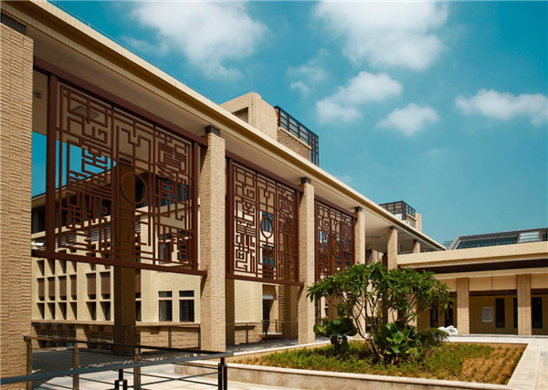 在該項(xiàng)目設(shè)計(jì)中,我院設(shè)計(jì)團(tuán)隊(duì)既充分借鑒傳統(tǒng)嶺南建筑的設(shè)計(jì)手法,采用傳統(tǒng)嶺南民居坡屋面的造型手法及通透的細(xì)部構(gòu)建(如遮陽板、通花窗),適應(yīng)嶺南地域獨(dú)有的氣候環(huán)境、文化特征、經(jīng)濟(jì)特征和技術(shù)特征;又借鑒了西方傳統(tǒng)的建筑構(gòu)造元素,結(jié)合結(jié)構(gòu)美學(xué)和建筑美學(xué),營造利用天窗采光的特色入口空間,體現(xiàn)暨南大學(xué)濃郁的僑校特色和開放性、包容性的校園文化。