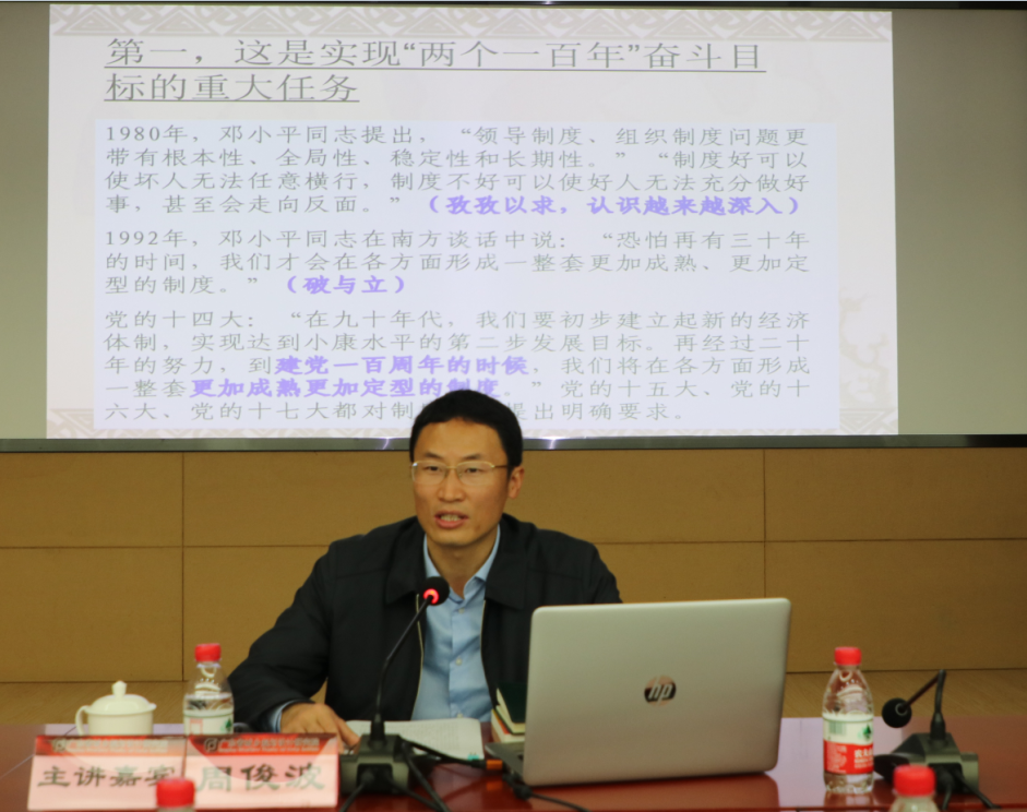 周俊波副主任結(jié)合近年來(lái)黨和國(guó)家事業(yè)取得的重大成就,闡明了全會(huì)的重大意義,闡釋了中國(guó)特色社會(huì)主義制度和國(guó)家治理體系的顯著優(yōu)勢(shì),對(duì)全會(huì)作出的《中共中央關(guān)于堅(jiān)持和完善中國(guó)特色社會(huì)主義制度、推進(jìn)國(guó)家治理體系和治理能力現(xiàn)代化若干重大問(wèn)題的決定》進(jìn)行了系統(tǒng)解讀,對(duì)學(xué)習(xí)宣傳貫徹全會(huì)精神、堅(jiān)定制度自信談了認(rèn)識(shí)體會(huì)。報(bào)告生動(dòng)鮮活、深入透徹、通俗易懂,使大家在深化對(duì)全會(huì)精神的理解上受益匪淺。