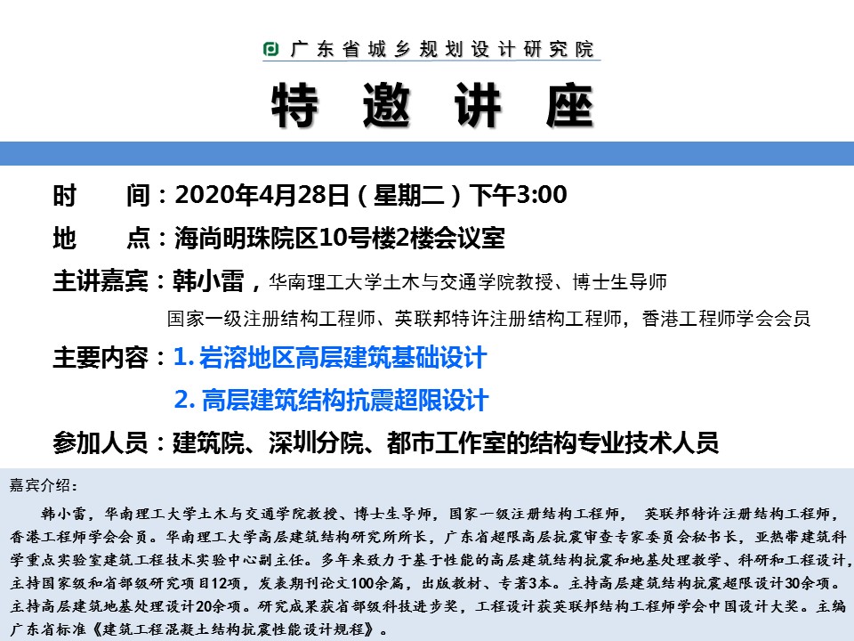2020年4月28日(星期二)下午,我院特邀華南理工大學(xué)土木與交通學(xué)院韓小雷教授,為我們作巖溶地區(qū)高層建筑基礎(chǔ)設(shè)計與高層建筑結(jié)構(gòu)抗震超限設(shè)計講座。