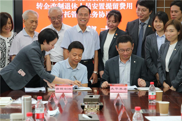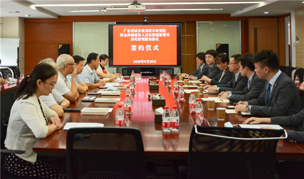 最后,在雙方人員的見證下,邱衍慶院長與趙春勇總經(jīng)理簽訂了《廣東省城鄉(xiāng)規(guī)劃設(shè)計研究院轉(zhuǎn)企改制事業(yè)編制退休人員安置提留費用委托管理服務(wù)協(xié)議》。本次簽約儀式標(biāo)志著委托管理服務(wù)全面正式運作。