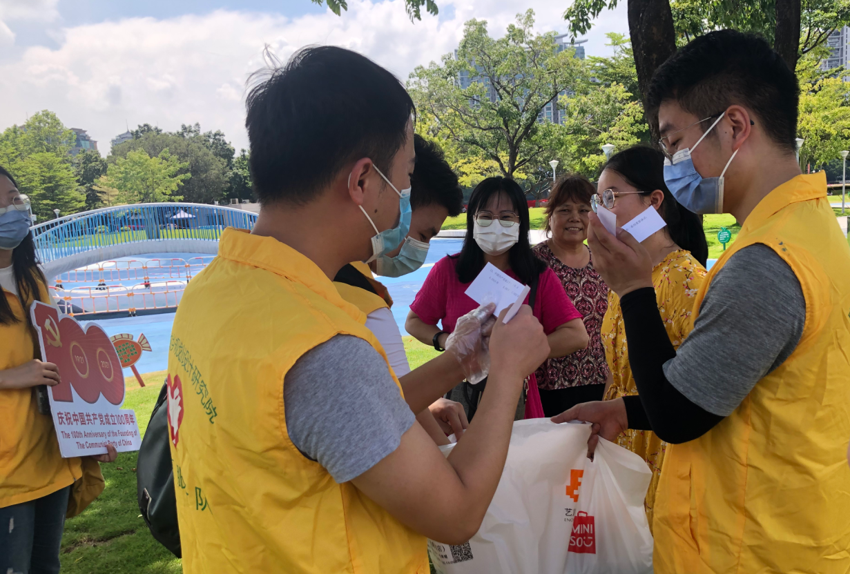 面向社會:二沙島黨史問答、撿拾垃圾、派發(fā)防疫物資等志愿服務(wù)。黨史學(xué)習(xí)教育結(jié)束后,在三所黨支部書記周元的帶領(lǐng)下,志愿者走進二沙島碧道,通過黨史知識有獎問答的方式,友好地與往來群眾交流,宣傳黨史知識。