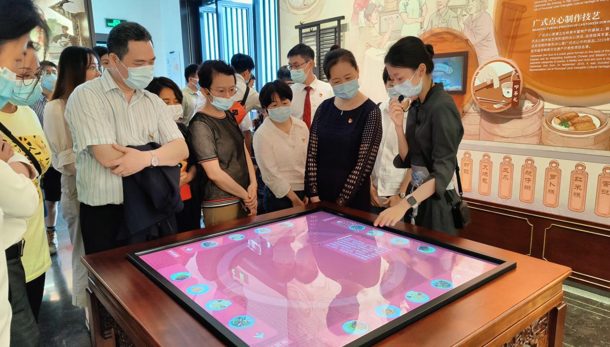 在非物質(zhì)文化遺產(chǎn)展示館,大家參觀了各式廣東傳統(tǒng)工藝展品,以及牙雕、玉雕、廣彩、廣繡、廣式家具等各式工藝精品。同時(shí),多媒體互動(dòng)科技的運(yùn)用為傳統(tǒng)非遺文化增添了新活力了,參觀人員用手機(jī)掃碼便能化身為電子小人,參與行花街、游神賽會(huì)、扒龍舟、舞火龍等民俗活動(dòng)。大家親身了解和學(xué)習(xí)非遺文化,感受中華傳統(tǒng)文明,對(duì)廣東本土燦爛的非遺文化作品稱(chēng)贊不已。