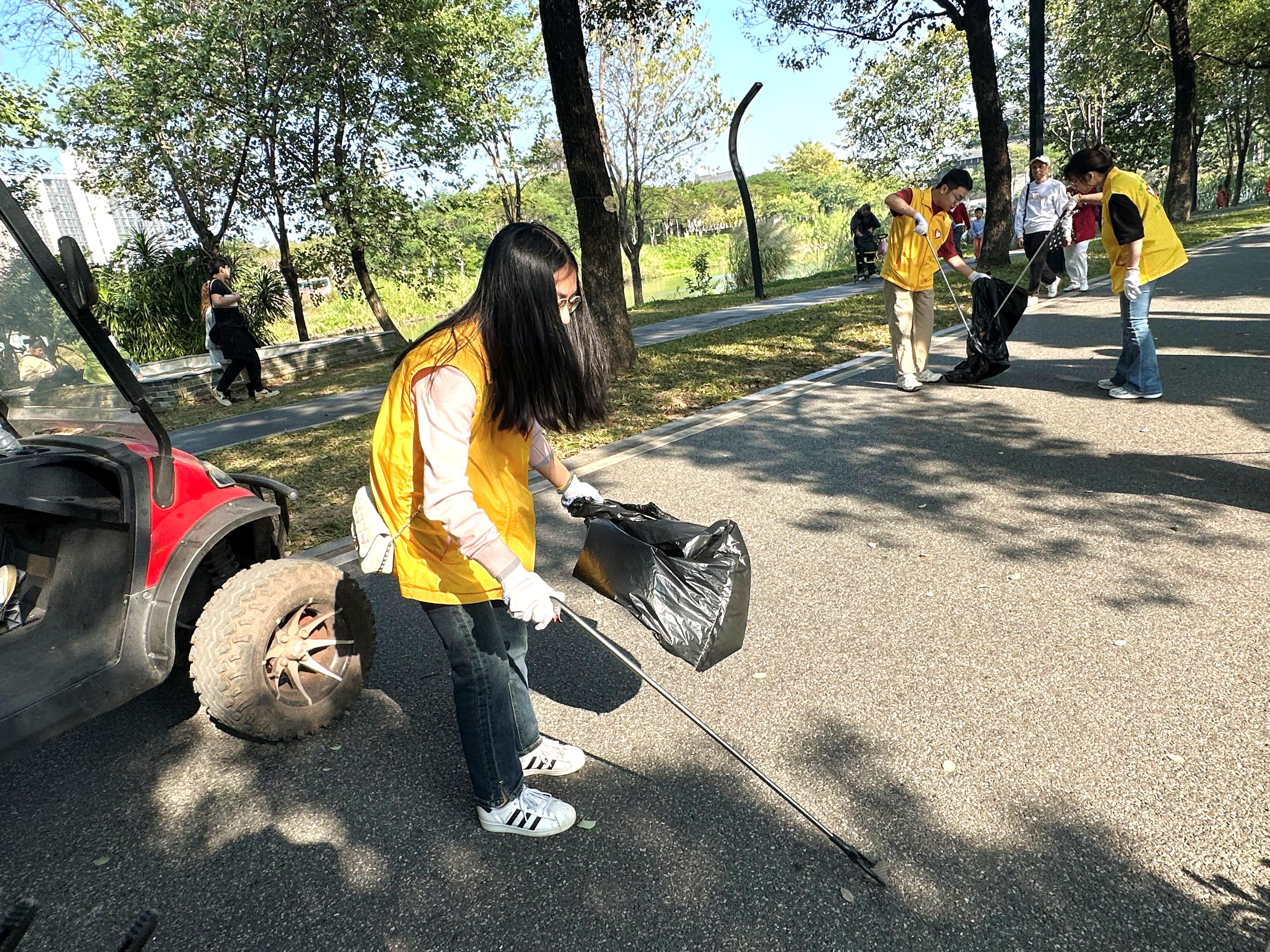 活動現(xiàn)場,志愿者們分組在海珠湖周邊清理垃圾,重點針對水岸線、草坪、林地及步道上的遺落垃圾,并確??苫厥瘴锱c不可回收物分別處理,展現(xiàn)了志愿者對環(huán)境保護的高度責任感。
