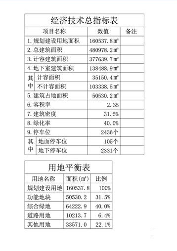 本項(xiàng)目總用地面積160537.8平方米(合240.8畝),規(guī)劃總建筑面積480978.2平方米,計(jì)容建筑面積377639.7平方米,地下室建筑面積138488.9平方米,容積率為2.35,綠地率為40.0%,建筑密度31.5%,總停車(chē)位數(shù)2436個(gè)。一期建筑面積242042.5平方米,包括門(mén)診部36935.4平方米,醫(yī)技部28901.8平方米,住院部60959.8平方米,醫(yī)療部分地下室54120.4平方米,一期職工宿舍47088.9平方米,一期職工宿舍地下室10916.2平方米,其他一期附屬用房3120.0平方米。