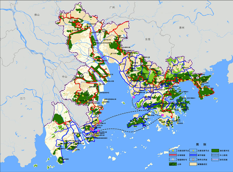 規(guī)劃基于布局條件評價體系,采用GIS可達性分析、密度分析、多因子疊加分析等多種方法,建構(gòu)了“節(jié)點—路徑”綠道選線模型,選取綠道適宜路徑,形成了契合珠三角區(qū)域生態(tài)格局的“6條主線、18處城際交界面,綠化緩沖區(qū)4410余平方公里”的省立綠道框架,總長2370余公里,整合串聯(lián)起廣佛肇、深莞惠、珠中江三大都市區(qū)200多處主要發(fā)展節(jié)點,分別體現(xiàn)了“大山大?!?、“山川田?!?、“生態(tài)和都市休閑”、“濱江休閑”等特色。