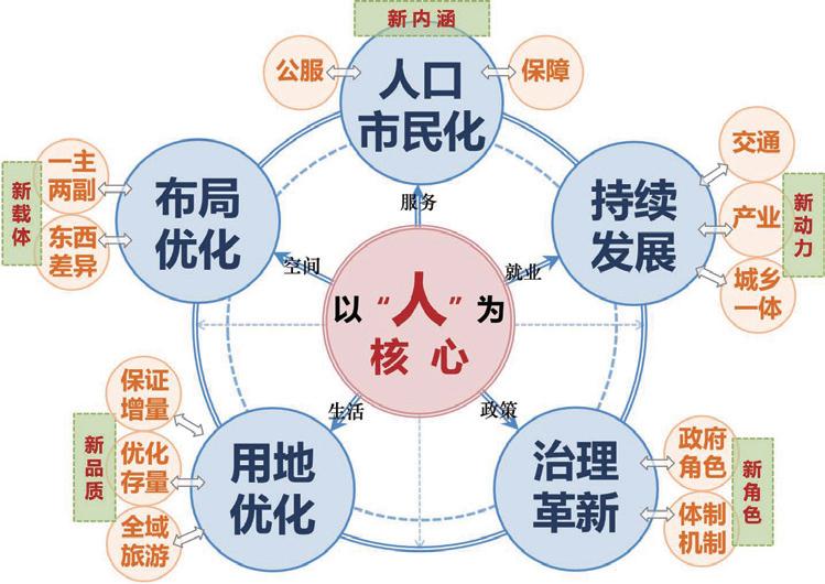 鎮(zhèn)化的價(jià)值和潛能?;凇耙匀藶楹诵摹钡男滦统擎?zhèn)化理念,創(chuàng)建“新內(nèi)涵”、“新載體”、“新動(dòng)力”、“新品質(zhì)”、“新角色”的“五個(gè)新”任務(wù)內(nèi)容框架。