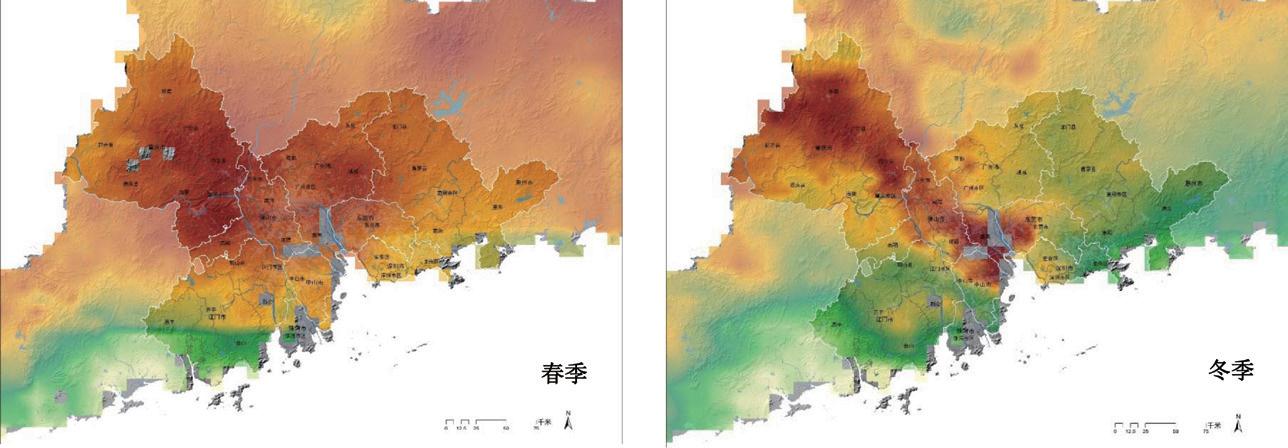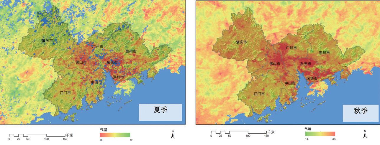 研究通過利用雙熱紅外波段反演地表溫度分布,珠三角內圈層(廣州、深圳、佛山、東莞等)熱島效應連綿且明顯,夏秋最為突出,主導風向對珠三角外圈層城市建成區(qū)下風向2—5km 地區(qū)影響較大,氣溫顯著高于其余非城市建成區(qū)。