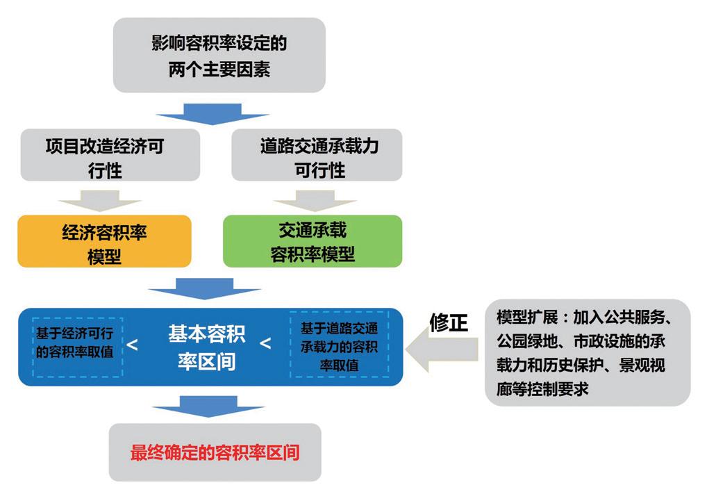 以城市存量建設用地再開發(fā)為重點的舊城改造規(guī)劃,普遍凸顯兩個以改造容積率為焦點的突出問題,一是對用地再開發(fā)容積率的經(jīng)濟可行性研究不足,改造項目難以推進,二是部分改造項目的容積率過高,加劇了舊城交通擁堵。容積率是否合理,成為掣肘舊城改造規(guī)劃是否可實施的關鍵內容之一。針對這兩方面問題,本研究在已有的容積率經(jīng)濟可行性研究、交通影響評價研究的基礎上,構建基于土地經(jīng)濟與道路交通承載力的容積率區(qū)間計算模型,開發(fā)基于GIS 軟件平臺的程序模塊,實現(xiàn)經(jīng)濟可行下限、道路交通可承載上限的容積率區(qū)間的自動量化計算。