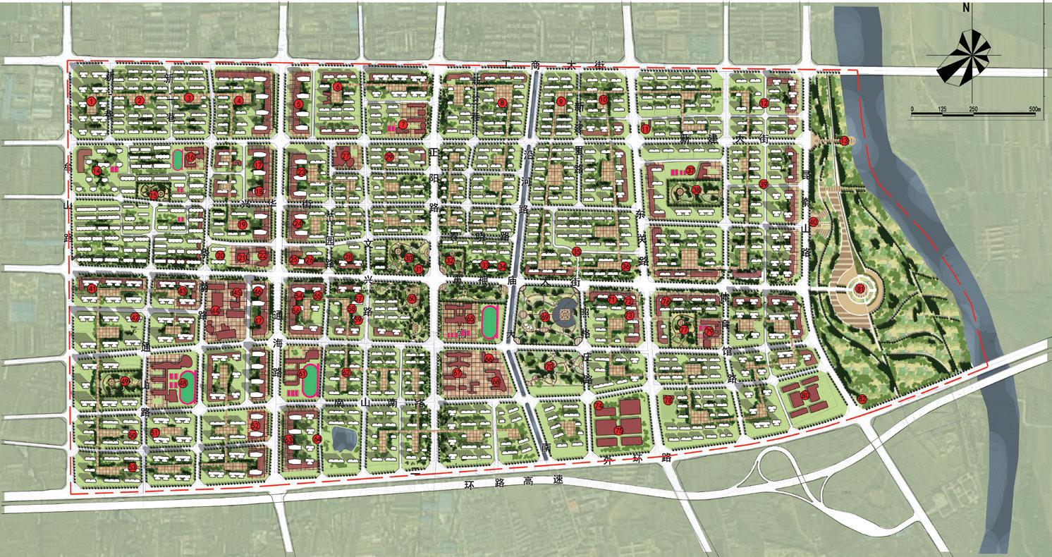 策略 1——延續(xù)生態(tài),保護基底;項目場地生態(tài)滲透趨勢明顯,東西分別有魚鳥河與沁水河兩條水系向北伸入,規(guī)劃預留生態(tài)廊道并將其引入內部,通過綠地及控制農林非建設用地的手法,形成方案生態(tài)景觀主骨架。