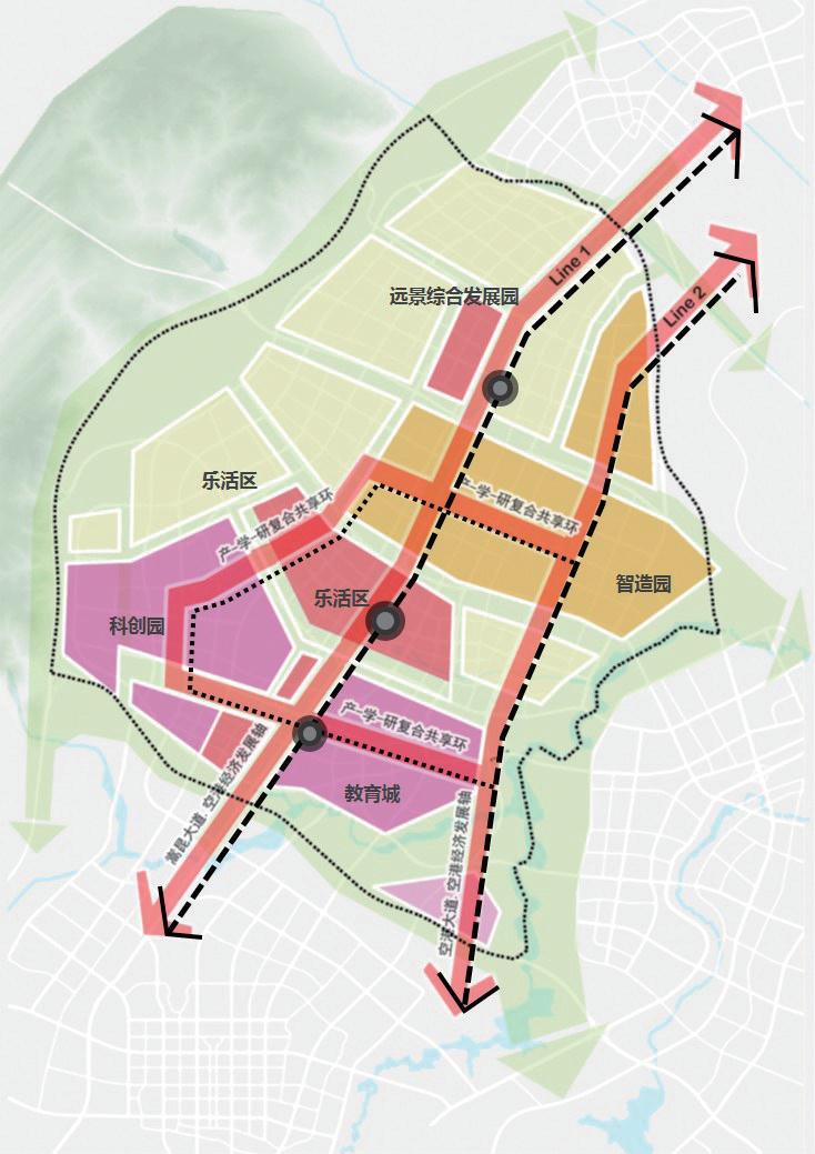 打造富于創(chuàng)新的活力空間,構(gòu)建便于交流的創(chuàng)新空間,營造有利于創(chuàng)新的活躍氛圍,重視休憩和交流空間的塑造。通過綠道、公園、廣場等開敞空間,將產(chǎn)業(yè)、教育、科創(chuàng)等功能區(qū)的設(shè)施和服務(wù)中心串聯(lián),形成產(chǎn)學(xué)研共享環(huán)。營造融合共享的生活交往空間、創(chuàng)新交流空間和服務(wù)空間,構(gòu)筑產(chǎn) - 學(xué) - 研 -城共生發(fā)展脈絡(luò)。