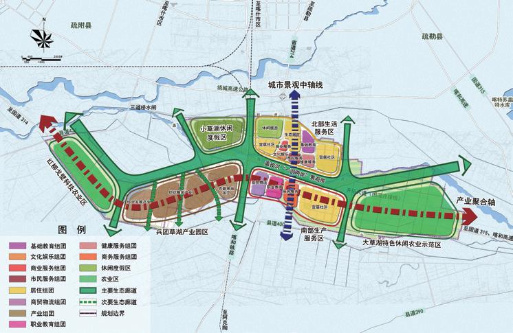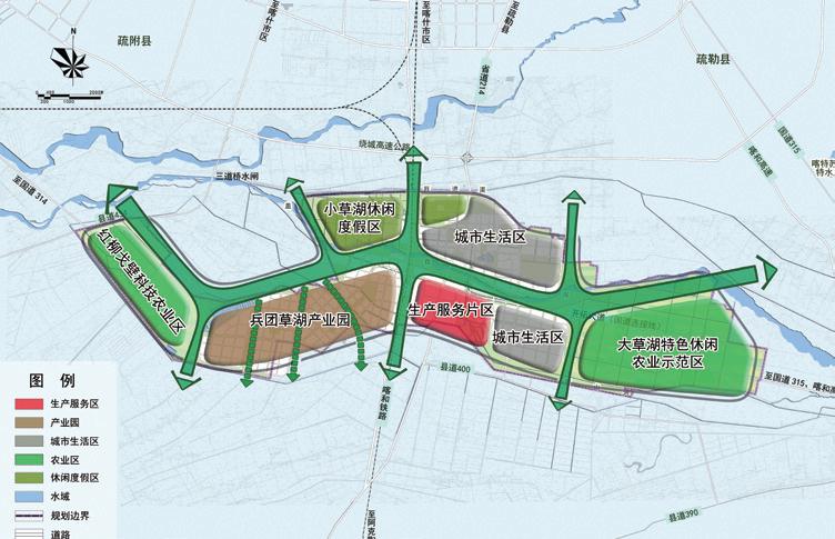 本次規(guī)劃探索了南疆干旱地區(qū)的生態(tài)綠洲城鎮(zhèn)產城融合發(fā)展的規(guī)劃建設模式,形成以下特色: