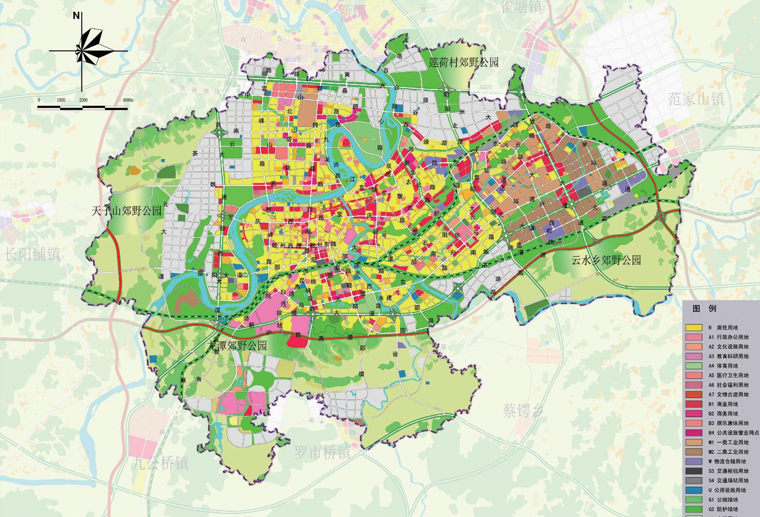 規(guī)劃中心城區(qū)形成“兩帶、三軸、四片、多組團(tuán)”的用地空間結(jié)構(gòu)。