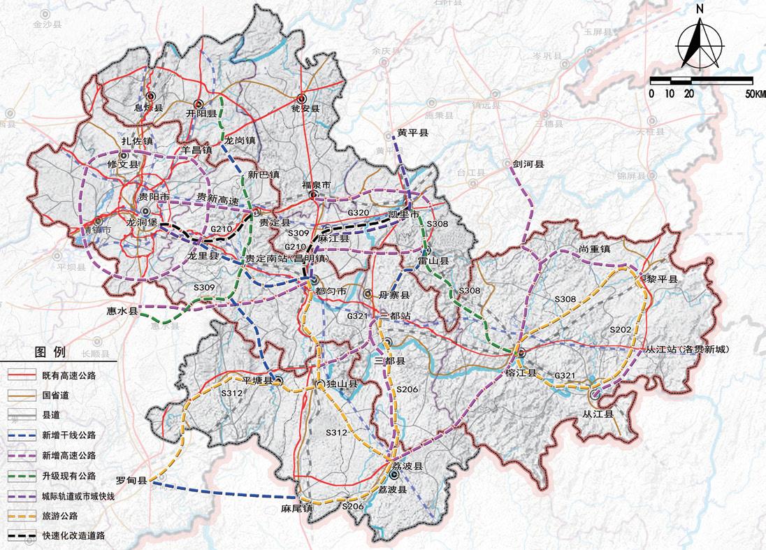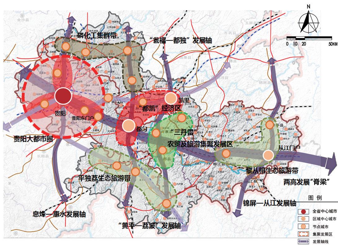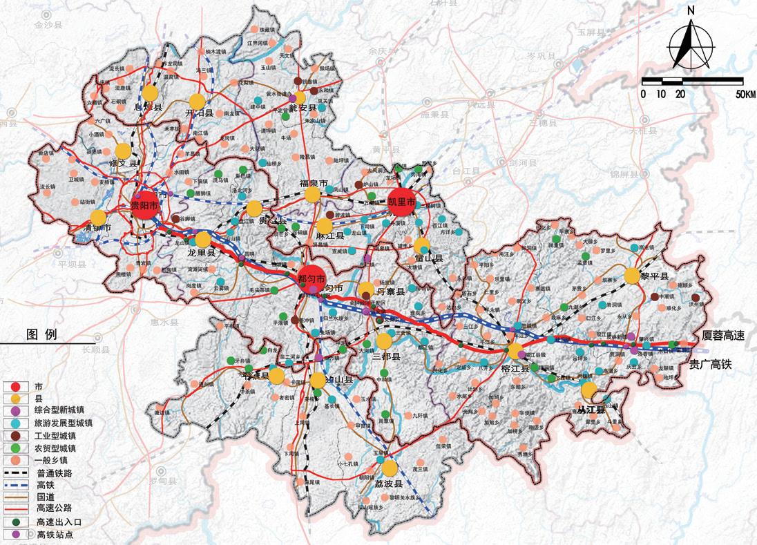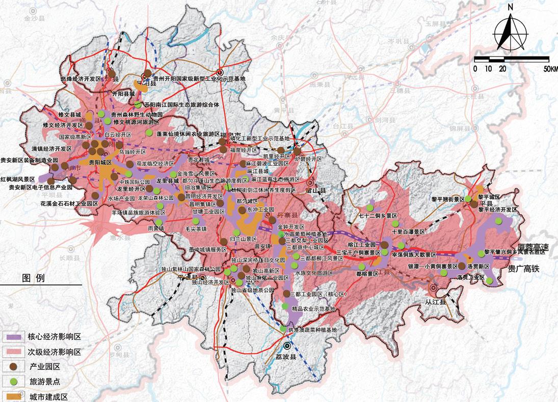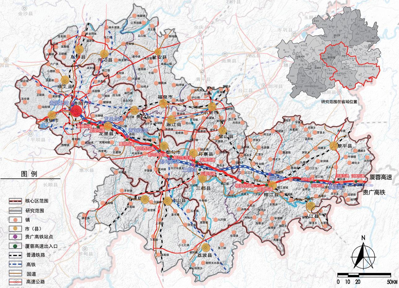 貴廣“兩高”指貴州省內(nèi)連接廣州的貴廣高速鐵路和廈蓉高速公路。貴廣“兩高”是我國西南地區(qū)聯(lián)動珠三角的主要通道,加強了粵、黔、桂三省的生產(chǎn)要素流通,推動泛珠三角經(jīng)濟一體化發(fā)展,為貴州省東南部欠發(fā)達地區(qū)及少數(shù)民族自治地區(qū)的發(fā)展帶來新的動力。本次研究聚焦于總結高鐵及高速公路對沿線城鎮(zhèn)發(fā)展在不同空間尺度下的影響機制,對沿線各地規(guī)劃成果進行檢討,對其與“兩高”帶動沿線地區(qū)發(fā)展模式的適應性進行評價,對各類規(guī)劃提出調整建議,實現(xiàn)以規(guī)劃引導沿線地區(qū)發(fā)展。