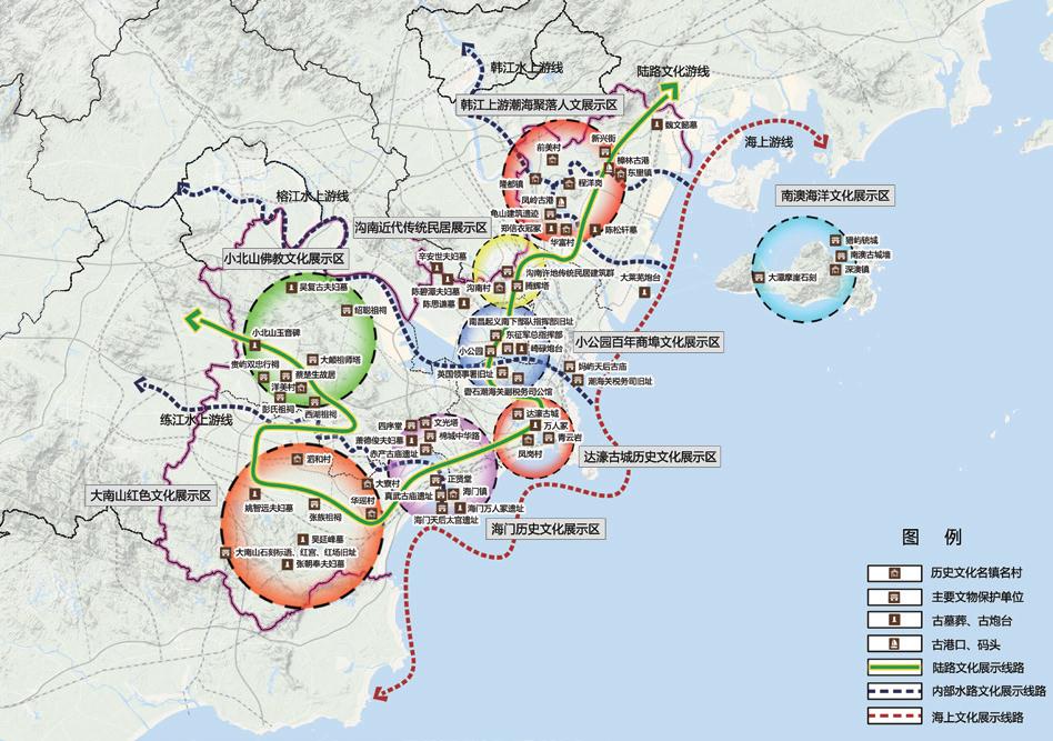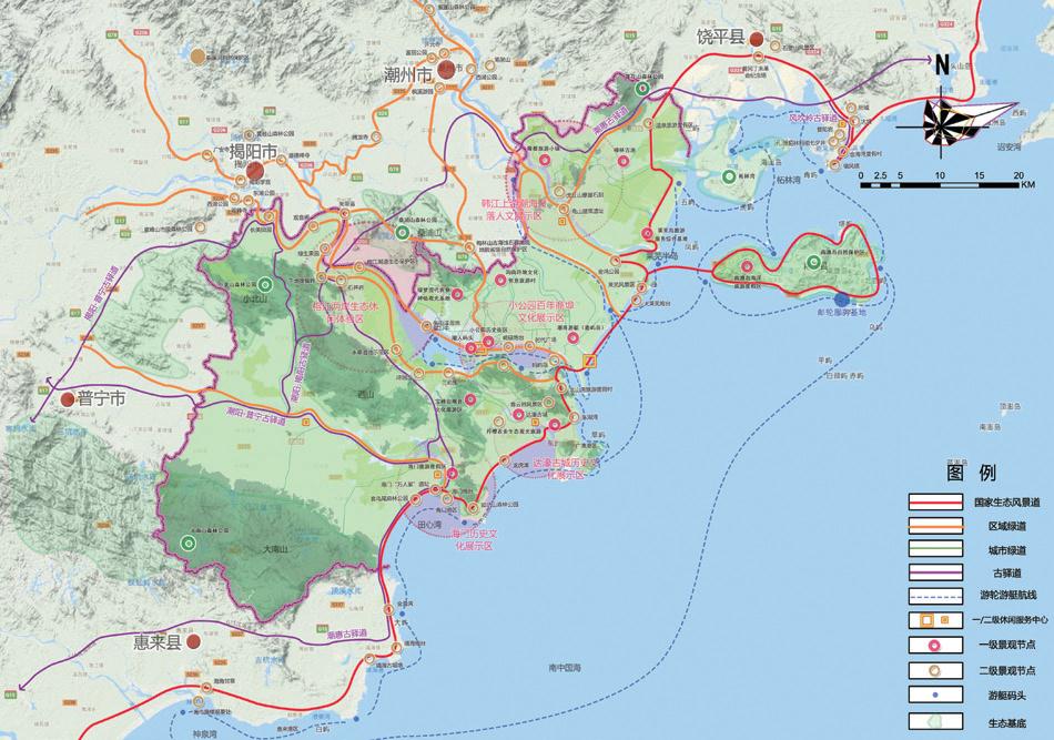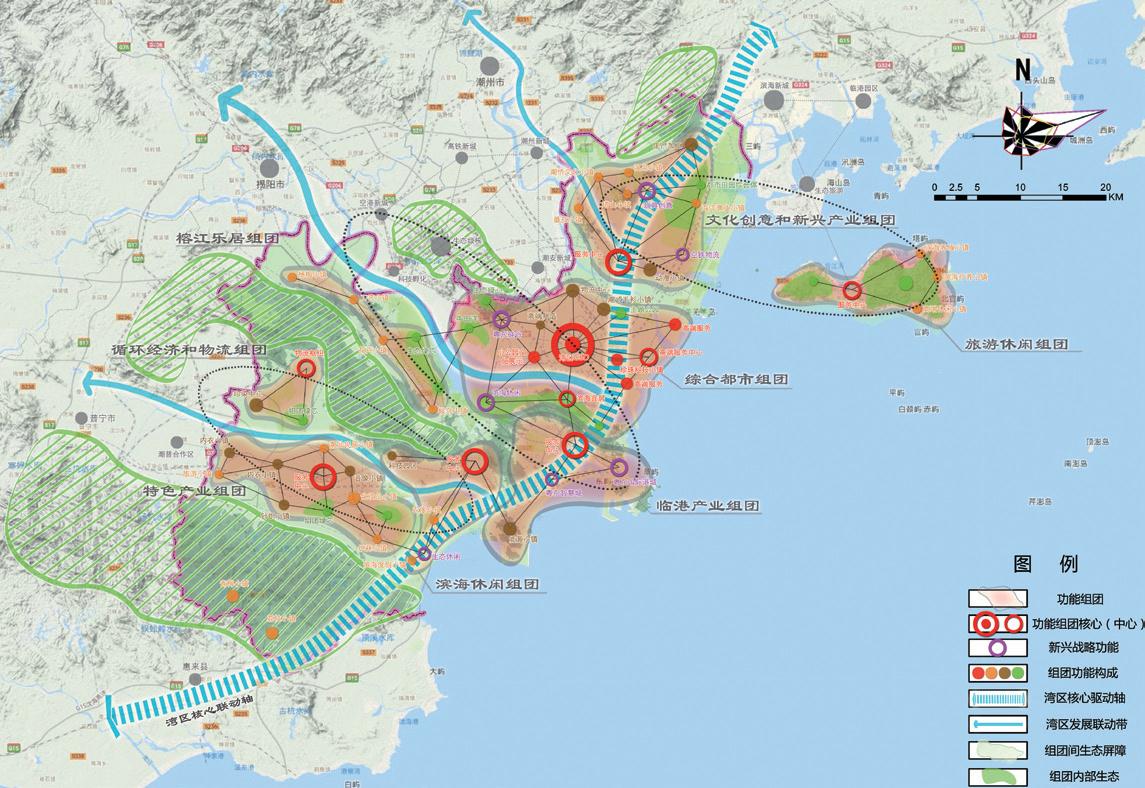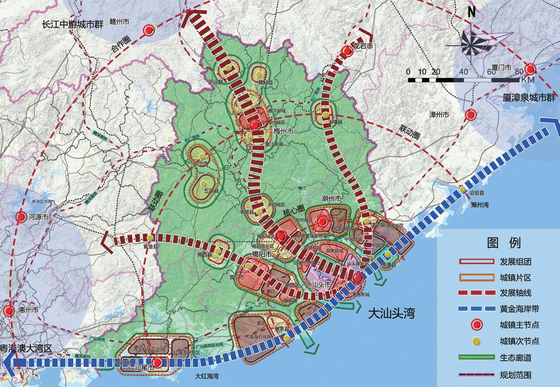 本次規(guī)劃研究不僅僅跳出“城市”的視角談“灣區(qū)”發(fā)展,更是跳出“單個(gè)灣區(qū)”的發(fā)展去實(shí)現(xiàn)跨區(qū)域的統(tǒng)籌聯(lián)動(dòng)。對(duì)于大汕頭灣區(qū)尤其是汕頭核心城市的發(fā)展,本次規(guī)劃不僅僅突破傳統(tǒng)的汕潮揭文化地域范圍,更是結(jié)合新的區(qū)域統(tǒng)籌發(fā)展和聯(lián)動(dòng)帶動(dòng)要求,將梅州、汕尾地區(qū)也納入本次規(guī)劃研究的范圍,甚至將廈漳泉、江西贛南地區(qū)也作為大汕頭灣區(qū)的聯(lián)動(dòng)或腹地范圍,從更大更高的視角拓展了潮汕地區(qū)發(fā)展的戰(zhàn)略思路,并從其整體空間格局、產(chǎn)業(yè)布局協(xié)調(diào)、區(qū)域生態(tài)共保、區(qū)域文化協(xié)同等角度,探索大汕頭灣區(qū)與其周邊地區(qū)的“中心 - 腹地”關(guān)系,并構(gòu)筑了新區(qū)域?qū)用娴目臻g發(fā)展框架。