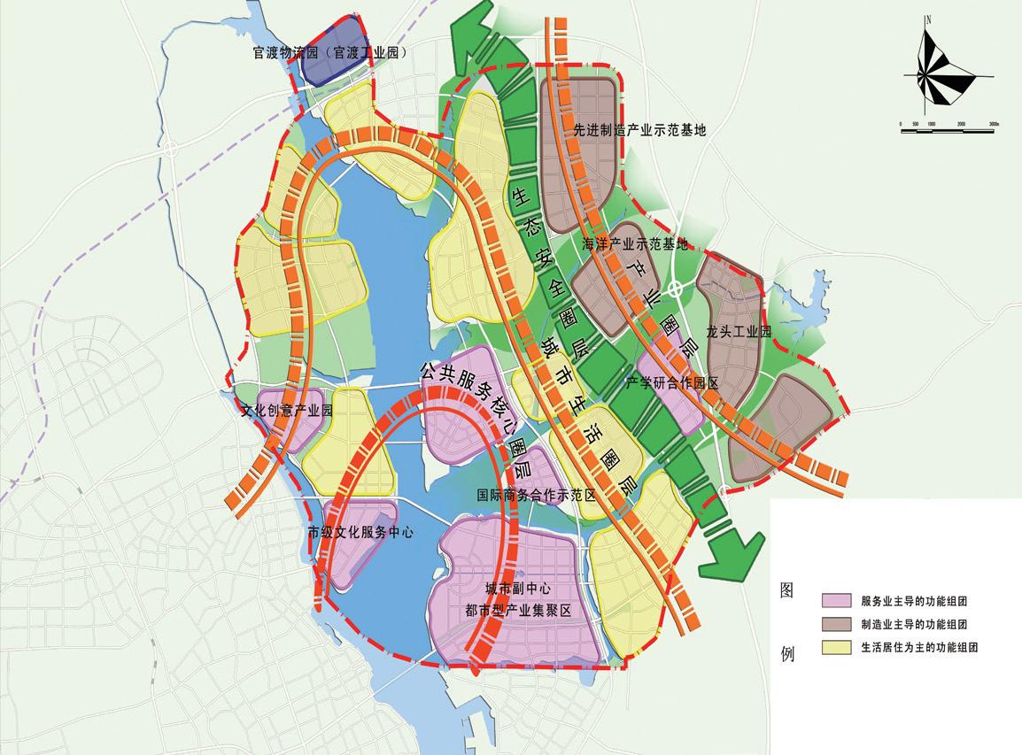 規(guī)劃從提升湛江中心城區(qū)輻射帶動能力出發(fā),注重新區(qū)與老區(qū)的有機(jī)聯(lián)系,落實湛江“一灣兩岸”的空間發(fā)展戰(zhàn)略。在麻斜海、龍王灣、官渡灣三水匯聚地區(qū),利用濱海岸線打造新區(qū)的公共服務(wù)核心圈層。在環(huán)灣濱海區(qū)域,打造城市生活圈層。借力空港和東海島產(chǎn)業(yè)區(qū)兩極帶動,在東部布局產(chǎn)業(yè)圈層。在城市生活圈層和產(chǎn)業(yè)圈層之間預(yù)留生態(tài)安全圈層。