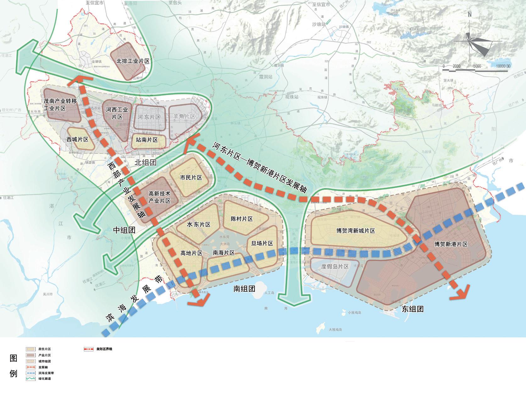 規(guī)劃通過(guò)深入分析濱海新區(qū)城市發(fā)展動(dòng)力,結(jié)合茂名及濱海新區(qū)當(dāng)前的城鎮(zhèn)分布特征,前瞻性地提出打造“兩軸一帶、兩大組團(tuán),多個(gè)片區(qū)”的濱海新區(qū)總體空間結(jié)構(gòu),為茂名及濱海新區(qū)的長(zhǎng)遠(yuǎn)發(fā)展搭建起了總體空間框架,為避免城鄉(xiāng)無(wú)序蔓延和“遍地開(kāi)花”提出了策略指引。