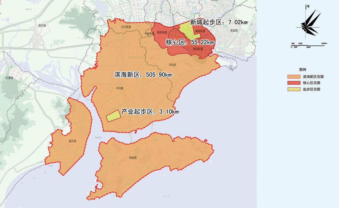 發(fā)揮新區(qū)濱海優(yōu)勢,以大陸海岸線和交通主干線為紐帶,按照“擁江達海、組團緊湊”的總體布局思路,規(guī)劃形成“一核、兩軸、三區(qū)、多組團”的總體空間結構。