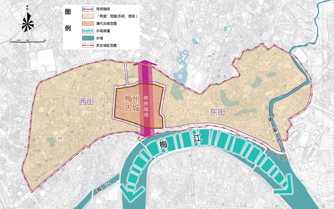 依據(jù)歷史城區(qū)概念(歷史范圍清楚、格局和風(fēng)貌保存較為完整的需要保護(hù)控制的地區(qū)),采用“歷史格局 + 風(fēng)貌評價 +行政評估”的劃定標(biāo)準(zhǔn),本次規(guī)劃納入了歷史格局(“一城兩街”)及現(xiàn)狀風(fēng)貌較為完整的 1949 年以前形成的城市建設(shè)空間,具體范圍為北至廣梅三路、梅州大道、僑新路、崗子上路北側(cè),南至梅興路、金利來大街、梅江,西至廣梅路,東至東山大道沿線(包含東山書院、崇慶堂),總面積為 2.64 km2。