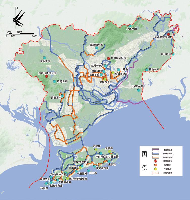 保護(hù)并維育市域重要生態(tài)斑塊,強(qiáng)化生態(tài)廊道建設(shè),構(gòu)建區(qū)域生態(tài)安全格局。推進(jìn)森林圍城、森林進(jìn)城,構(gòu)筑多層次生態(tài)網(wǎng)絡(luò),形成顯山露水的城市生態(tài)安全格局。至 2030 年森林覆蓋率達(dá)到 65%;城市人均公園綠地面積為 18km2。