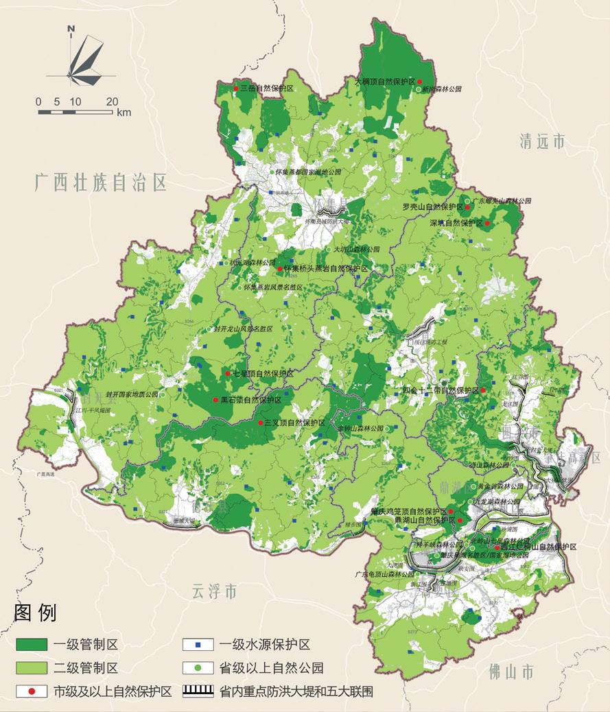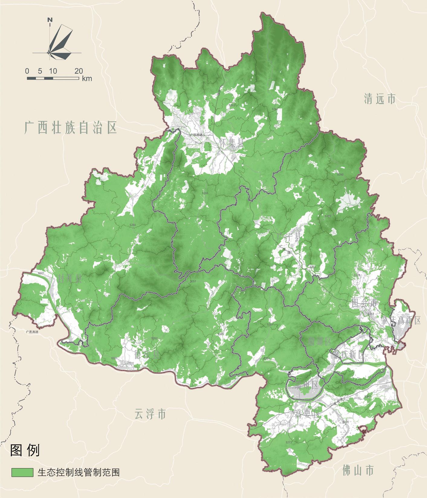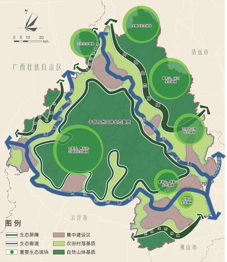 規(guī)劃形成“一區(qū)多屏、四廊多點(diǎn)”的生態(tài)安全格局結(jié)構(gòu)。一區(qū)多屏:指肇慶市域中部自然山體形成的生態(tài)保護(hù)區(qū)和圍繞在市域周邊的多條外圍生態(tài)屏障。