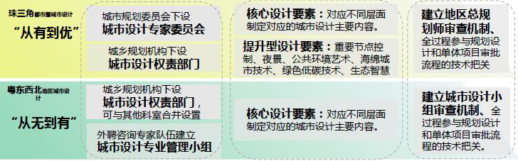 將廣東省劃分為珠三角地區(qū)和粵東西北地區(qū)兩區(qū),各區(qū)內(nèi)進一步劃分重點城市與一般城市,粵東西北地區(qū)實現(xiàn)城市設計從無到有的跨越式發(fā)展,促進城市特色與品質(zhì)的提升;珠三角地區(qū)加快城市設計創(chuàng)新,實現(xiàn)城市設計從有到優(yōu),城市設計工作從“地區(qū)失衡”走向“全省兼顧”。針對不同地域,城市設計專設機構(gòu)中按兩區(qū)分設權(quán)責部門;城市設計編制內(nèi)容深度按兩區(qū)提出核心與提升型要素要求;城市設計實施與管理中鼓勵發(fā)達地區(qū)探索管理新模式。