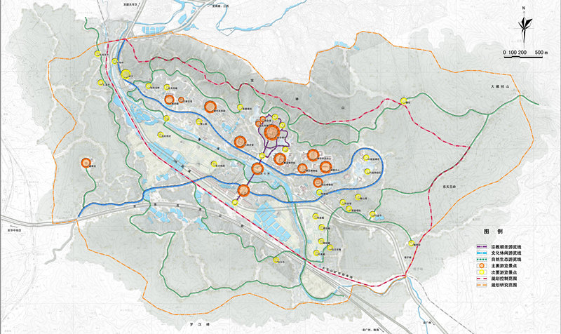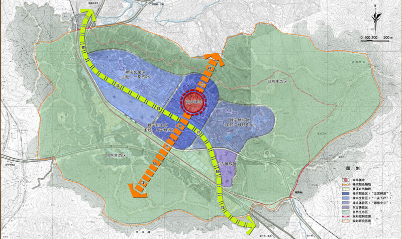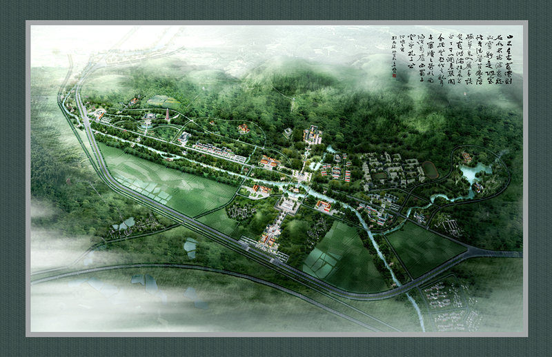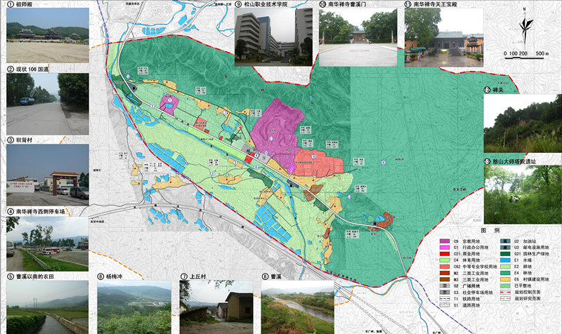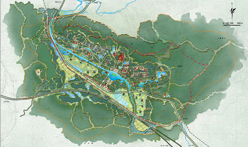 規(guī)劃以“文化再生”理念指導(dǎo)空間布局和城市設(shè)計(jì)。首先,結(jié)合大南華地區(qū)的自然山水特征和建設(shè)格局,確定大南華地區(qū)“山、林、寺、溪、田”的總體控制格局;將以南華禪寺為核心的歷史文物保護(hù)、環(huán)境整治、項(xiàng)目布局結(jié)合,構(gòu)筑“一心兩軸四區(qū)”的空間布局結(jié)構(gòu),對(duì)土地利用、道路交通、村莊搬遷安置、服務(wù)設(shè)施配置、分期實(shí)施等進(jìn)行統(tǒng)籌安排;在此基礎(chǔ)上,對(duì)規(guī)劃研究范圍內(nèi)的建筑風(fēng)格、綠化、環(huán)境景觀等進(jìn)行深入設(shè)計(jì)。
