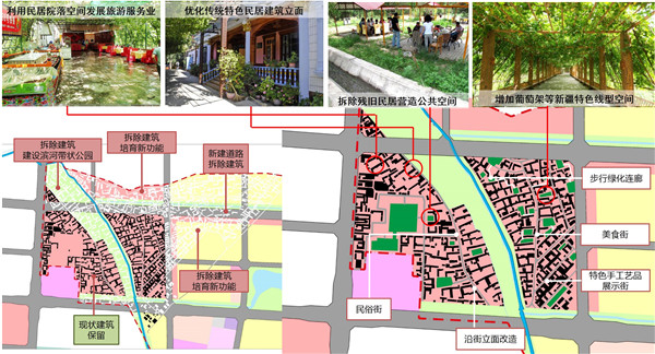 五連片區(qū)林木資源豐富,院落建筑特征明顯,地方民族特色突出,規(guī)劃通過“保-改-增”,識別并保留現(xiàn)狀有價值的街巷與院落空間,拆除殘舊建筑營造小游園、小廣場等公共空間,對保留民居植入農(nóng)家樂等旅游服務產(chǎn)業(yè)功能,增加雅爾托汗渠“翡翠綠鏈”式線型公園,打造“博河屯”休閑區(qū),打造成為博樂市人民健康休閑的“好去處”、展示博州民族風情小鎮(zhèn)的好窗口、兵地共建特色宜居小鎮(zhèn)的好樣板。