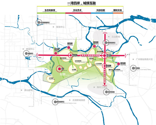 東平水道、櫓尾撬涌和陳村涌構(gòu)成的水灣,與南側(cè)的生態(tài)綠地一起構(gòu)成了三龍灣高端創(chuàng)新集聚區(qū)的邊界,并承擔著吸引與過濾的雙重職能。