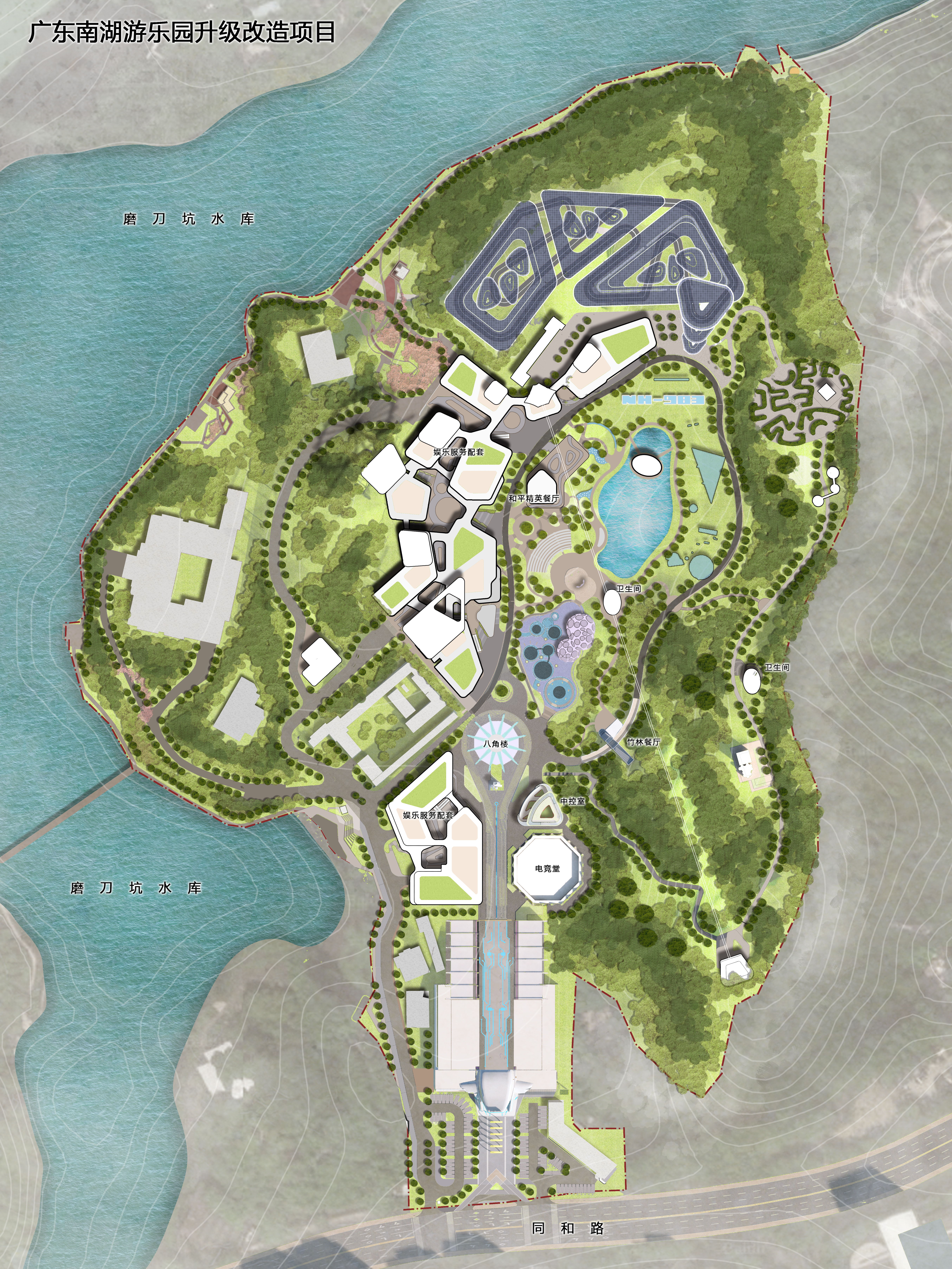 廣東南湖游樂園坐落在白云山北麓,是廣東省“國家旅游度假區(qū)”的重要組成部份,占地26萬平方米,是廣州市區(qū)內(nèi)集游樂與生態(tài)于一體的大型主題樂園,園內(nèi)依山傍水,環(huán)境幽雅,風(fēng)景秀麗。設(shè)計(jì)合理利用場(chǎng)地現(xiàn)狀條件,圍繞游樂、研學(xué)、休閑功能為核心,充分挖掘地方特色文化元素確立了以南湖印象為內(nèi)核,以“中軸北萃”、“沉浸體驗(yàn)”、“未來生活”為主題,旨在構(gòu)建都市核心、山水勝景、未來體驗(yàn)型文化特色的主題旅游度假區(qū)。