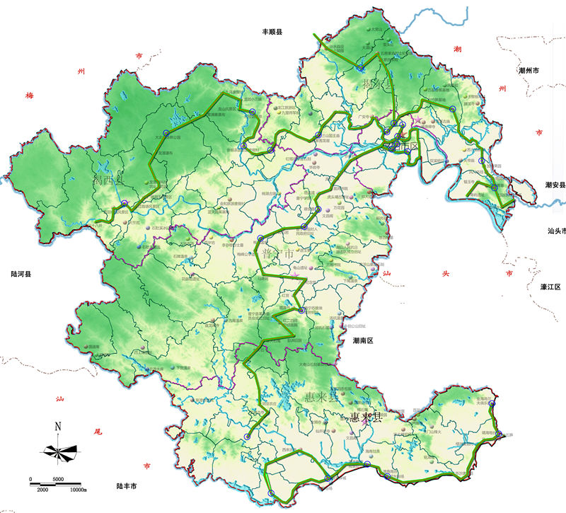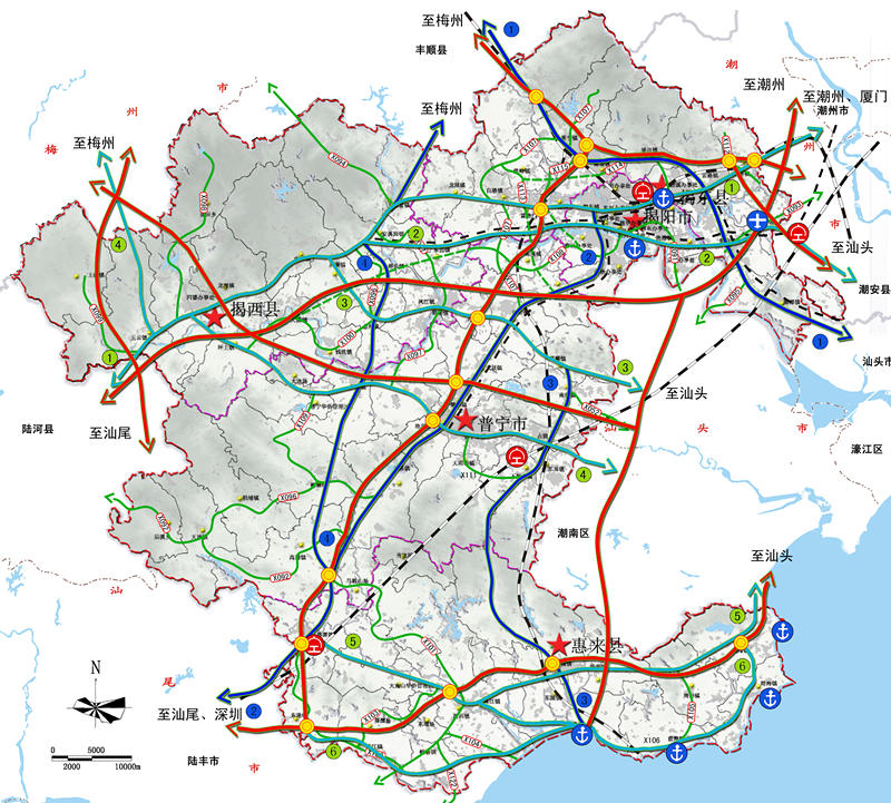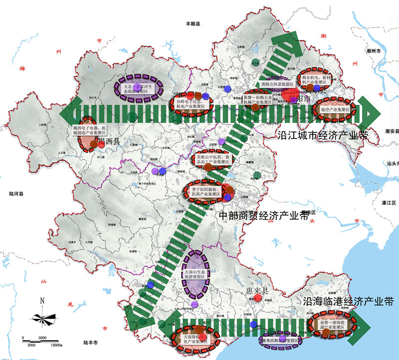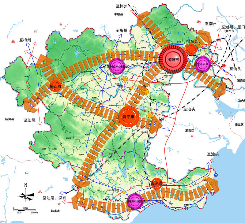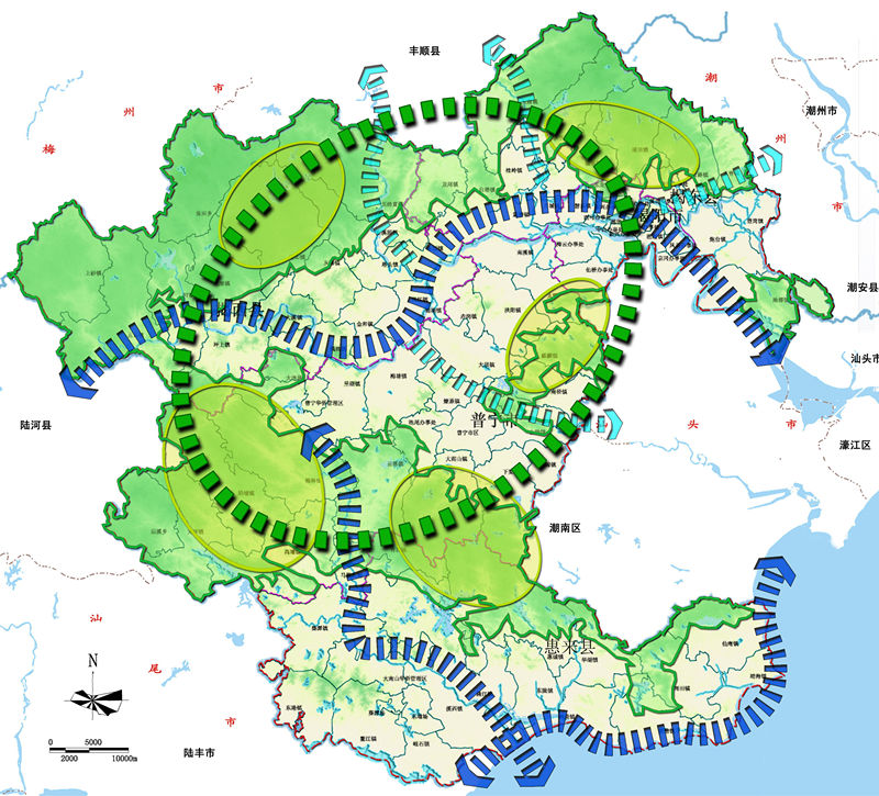 規(guī)劃通過梳理市域自然生態(tài)環(huán)境要素,提出了“一環(huán)、三帶、四廊道、五斑塊”的生態(tài)綠地系統(tǒng)結(jié)構(gòu)和 5 條主干綠道網(wǎng)布局。規(guī)劃較好地將粵東現(xiàn)場(chǎng)會(huì)會(huì)議精神對(duì)揭陽(yáng)的發(fā)展要求,融入到規(guī)劃中,突出強(qiáng)調(diào)了打造“特色揭陽(yáng)”的規(guī)劃部署和行動(dòng)安排。特別是這次城鎮(zhèn)體系規(guī)劃,為揭陽(yáng)市爭(zhēng)取中石油煉油項(xiàng)目、珠海(揭陽(yáng))產(chǎn)業(yè)轉(zhuǎn)移工業(yè)園申報(bào)省示范產(chǎn)業(yè)園等重大項(xiàng)目,提供了強(qiáng)有力的規(guī)劃支撐,也為揭陽(yáng)市中心城區(qū)城市總體規(guī)劃修編提供了有效的指導(dǎo)。