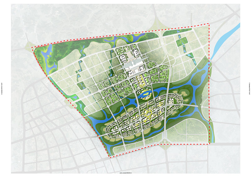 4. 項目面對一個核心問題是一個邊緣地區(qū)的發(fā)展的問題,現(xiàn)狀城市建設(shè)量極少,幾乎全部為村莊農(nóng)田,這樣一個區(qū)域的發(fā)展,要協(xié)調(diào)好邊緣綠心的關(guān)系,生態(tài)環(huán)保與發(fā)展的關(guān)系,在項目中,大膽嘗試采取田園城市的設(shè)計理念,強調(diào)新城開發(fā)必須遵守環(huán)境友好和資源節(jié)約原則。